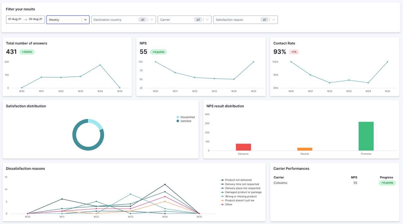 You'll have data on carrier performance, the breakdown of satisfaction by reason, NPS, and reasons for dissatisfaction.
