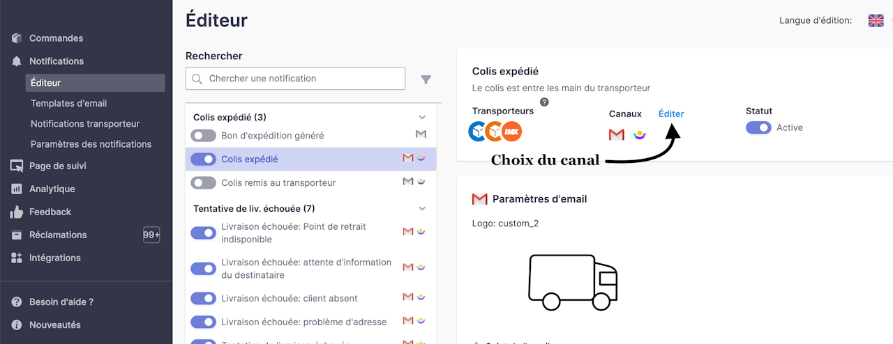Une fois la campagne créée, rendez-vous dans l'onglet Notifications > Éditeur côté Shipup.