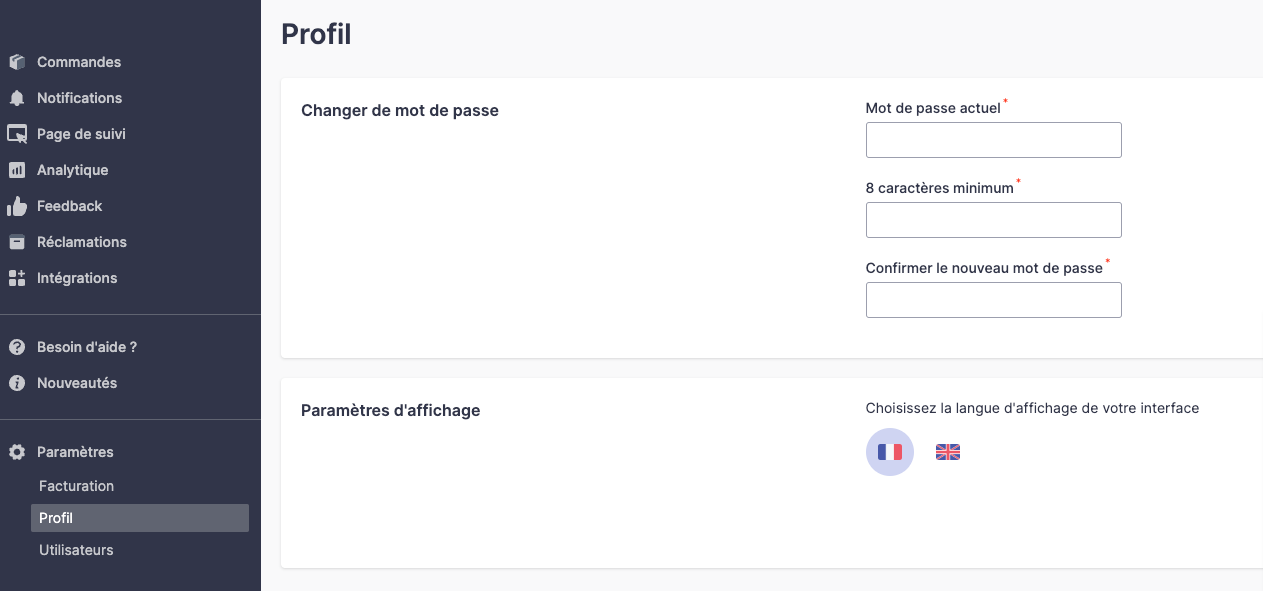 • Gestion de la langue du compte (français ou anglais). Cela n'impactera QUE votre compte, pas celui de vos collègues.