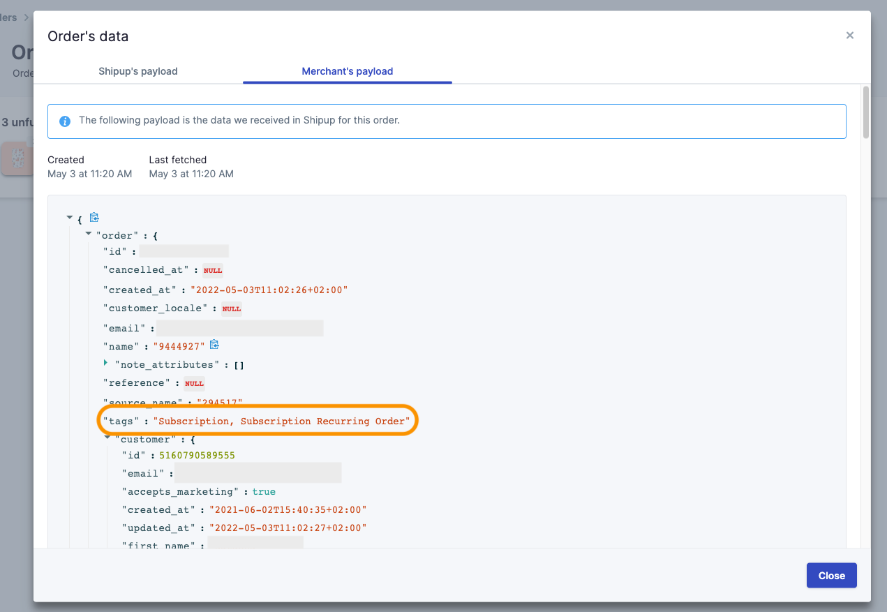 En récupérant les informations de commande de Shopify, Shipup extrait également les balises Shopify et les stocke. Le format utilisé pour stocker les tags est : tags = "tag_1,tag_2"