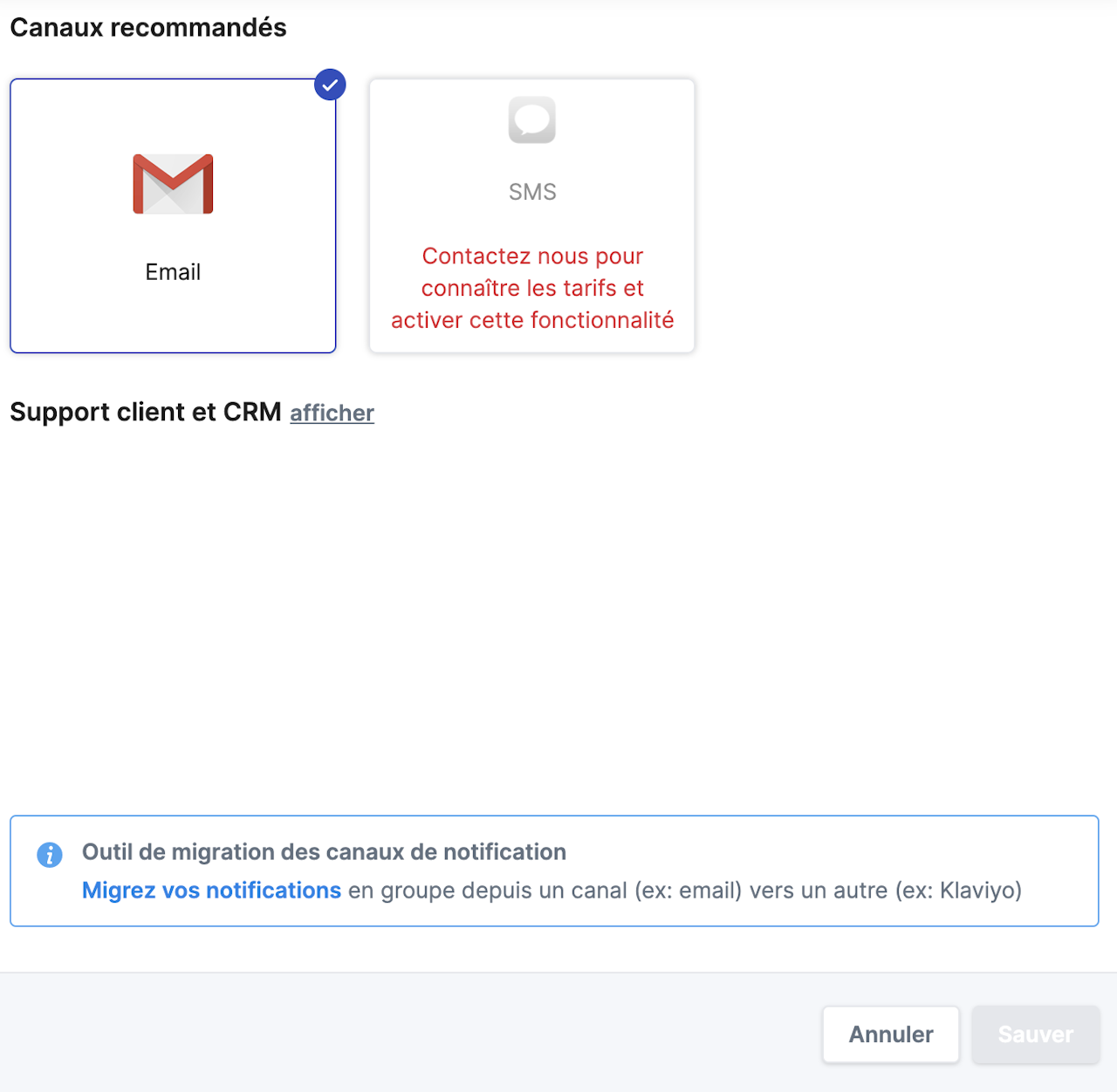 Il faut pour cela désactiver le canal e-mail et activer le canal Klaviyo pour toutes les notifications.