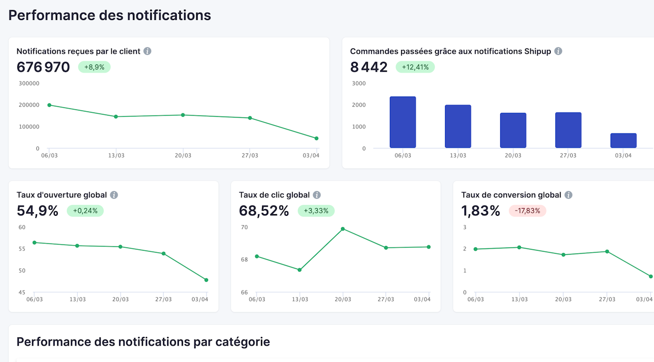 Performance par catégorie de notifications : ce widget regroupe les performances de tous les avis d'une catégorie donnée.