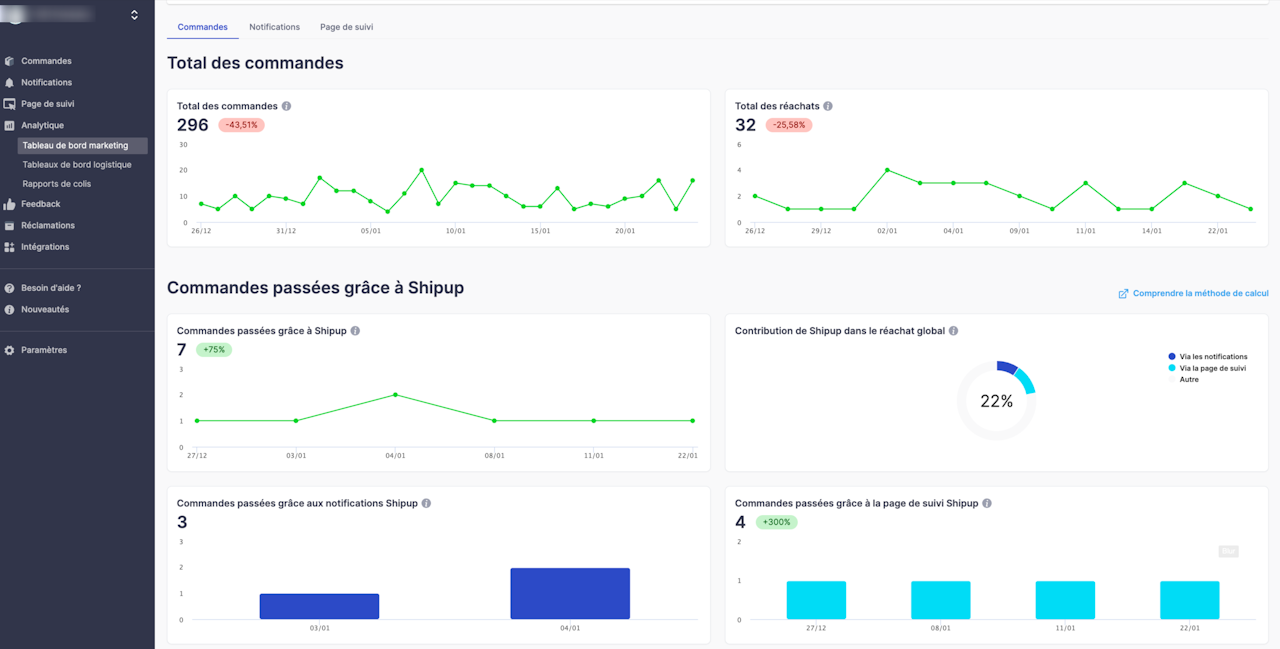 commandes passées grâce à la page de suivi Shipup